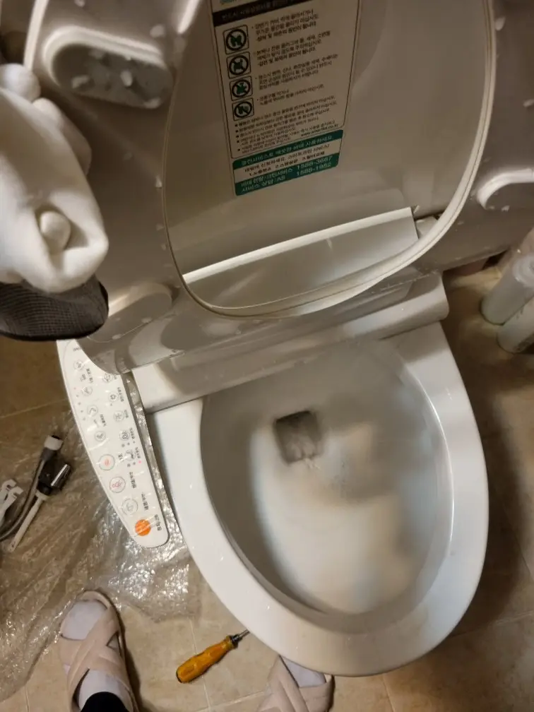 현장에 도착해서 변기 탱크 뚜껑을 열어보니 역시 물이 계속 흘러내리고 있었습니다. 급수 밸브와 플러시 밸브를 확인한 결과 여러 부품이 노후화되어 제 기능을 못 하는 상태였습니다. 부분 수리보다는 주요 부품을 전체 교체하는 것이 좋겠다고 판단했습니다.